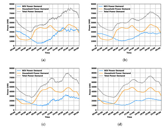 In Figure 13a,b, temporal distribution of the charging power demand for a working day (Monday–Thursday) is depicted in blue for 11 kW charging power and 3.7 kW charging power, respectively. In orange, the temporal distribution of the cumulative household power demand within the LOR can be seen. In grey, the superposition with the simulated charging power demand of the BEVs is shown. The results for a Saturday are depicted in Figure 13c for 11 kW charging power and in Figure 13d for 3.7 kW charging power. As it can be seen, the cumulative household power demand between 06:00 and 23:00 is higher on Saturdays, since persons are more likely to be at home, as they do not have to work.