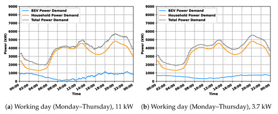 As depicted in Figure 13, the charging power demand curves of the BEVs for 11 kW charging power show a more pronounced valley and peak compared to their corresponding curves for 3.7 kW charging power. Due to the uncontrolled charging strategy, the vehicles start charging immediately upon arrival at home, which is mainly in the evening hours. The resulting simultaneity of the charging events leads to a peak in the evening hours (maximum around 20:00), which is higher for an 11 kW charging power compared to a 3.7 kW charging power. Since vehicles that are charged with 11 kW charging power need less charging time to fully recharge, the valley of the BEV charging power demand curve is lower for 11 kW charging power compared to 3.7 kW charging power.