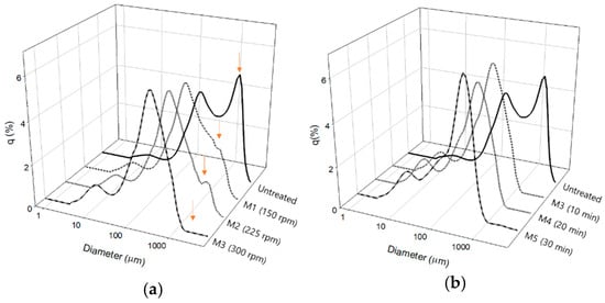 Size distributions of pretreated food waste based on (a) milling speed and (b) milling time.