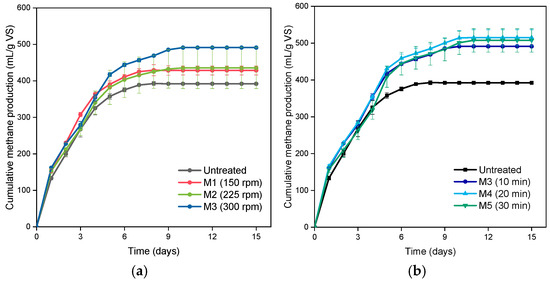 Cumulative methane productions from the food waste based on (a) milling speed and (b) milling time. The error bars indicate standard deviation.