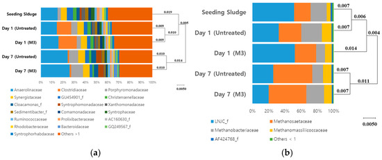 As observed on day 7, shown in Figure 3, the examination of archaeal community showed Methanosaetaceae as the predominant family. The relative abundance of Methanosaetaceae increased to 48–49% under both conditions (Figure 3). Methanosaeta concilii was the most dominant species observed under both conditions, with its relative abundances increased to 30.2% and 30.3%, respectively. In addition, considerable uncultured Methanosaeta species were observed, and these species also seemed to play a role as a methanogen using an acetoclastic mechanism [45]. Interestingly, the relative abundance of hydrogenotrophic methanogen was observed to be 13.5% in the untreated sample on day 7, whereas for the ball-mill treated sample, it increased up to 21.7% (Figure S2 and Table S1). Most hydrogenotrophic methanogens were composed of Methanobacterium species and this genus can produce methane mainly using carbon dioxide and hydrogen [46]. Carbon dioxide and hydrogen have been considered as the final metabolites of anaerobic bacteria, such as Clostridium, which was considered to increase the growth of hydrogenotrophic methanogen. Consequently, the ball-mill pretreatment increased the activity of methanogenic Archaea using the end-products of bacteria by allowing food waste to be readily available via softening and breaking processes.