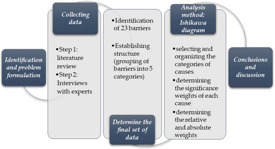 For this reason, the Authors of the present paper attempted to analyze the reasons for the slower implementation of BIM technology in the Polish construction process. The literature on the subject was reviewed, the available Polish market reports were analyzed, as well as documentation of individual cases of construction projects, and interviews with experts were performed in order to identify obstacles in the use of BIM technology in Poland. In order to classify and analyze the identified barriers, a quality management tool, namely the Ishikawa diagram [31], was used. The diagram makes it possible to identify phenomena and errors that influence the lack of success and the risk of failure of a given project. Its advantage is primarily the identification of areas where processes need to be improved [31]. Cause-and-effect analysis using the Ishikawa diagram may be burdened with a subjectivism error, therefore, in the conducted analysis, the Authors presented a weighted Ishikawa diagram, where individual factors were given appropriate significance weights, in order to indicate the best structure of causes affecting the poor implementation of BIM technology in projects performed in Poland. The subsequent stages of the research are presented in Figure 1.