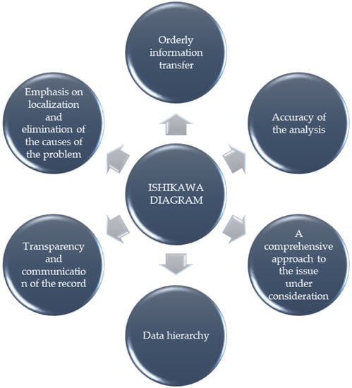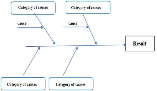The Ishikawa diagram was developed by Kaoru Ishikawa, professor at the University of Tokyo, and was first used by the Japanese company Sumitomo Electric [62]. It is a traditional and frequent tool used in the field of quality management. It is defined as a graphic representation that schematically illustrates the relations between a specific result and its causes. The main assumptions of this tool are to rank the occurring causes of errors and inconsistencies in a given research area and to determine the interrelationships between these causes. The identified causes are presented graphically as a fish bone diagram (or a fish skeleton) where [63]: