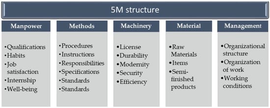The essence of the qualitative tool which is the Ishikawa diagram is to identify the causes and sub-causes influencing the research area. In order to efficiently search and determine the nature of variation in the process, the so-called the 5M framework was adopted, according to which most problems and errors concentrate in five categories: People (Manpower), Method, Machine, Material, Management. An example of the scope of each category is presented in Figure 4.