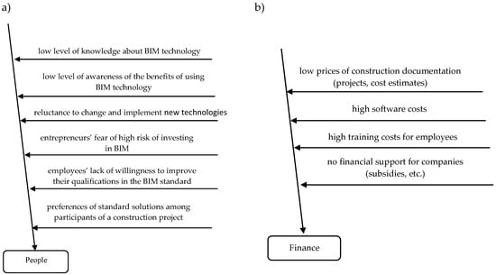 Category I—People—this group includes 6 reasons that contribute to the poor implementation of BIM in the construction process in Poland. The causes are shown in Figure 5a, as part of the Ishikawa diagram, the fishbone.
