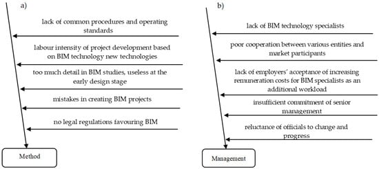 Category III—Method—in the Method category, 5 causes were identified, which can be divided into 3 groups. The first one concerns the design and virtual modeling itself and the resulting limitations, such as very high labor consumption in the implementation of multidimensional models, very high detail, which is not required in the early preparation of the concept of a facility, and frequently occurring errors, resulting mainly from the designer’s lack of knowledge. The second group of reasons consists of barriers related to the developed methods and standards of operation, which are not standardized or common to each participant in the construction process. The last group includes the lack of legal regulations that would support faster implementation of BIM technologies, for instance in public procurement. The 5 identified causes are presented in Figure 6a.