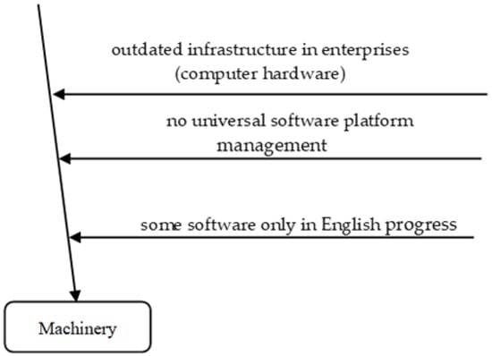Category V—Machinery—3 barriers have been assigned to the last category, namely the Machinery, regarding both BIM software and computer hardware available in companies. Such factors as the lack of a universal platform for BIM software were distinguished here and attention was drawn to the fact that the add-ons and plugs the software uses are only in English, which causes great difficulties for older participants in the construction process. Another limitation concerns computer hardware in small and medium-sized companies, which is sometimes outdated and insufficient to generate multi-dimensional models. These reasons are presented in Figure 7.
