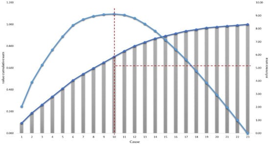 Due to the use of stratification analysis, which is based on the Pareto rule (80:20), the main areas and groups of phenomena were identified, where preventive measures should be introduced in the first place. The index of division of the most important factors is the reference area, that is, the area of the rectangle defined by a point on the Lorenz curve. Figure 10 shows the Lorenz curve and the curve of the reference field for each cause.