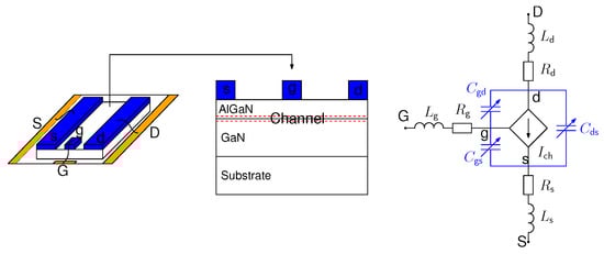 - Jardel, O.; Callet, G.; Charbonniaud, C.; Jacquet, J.C.; Sarazin, N.; Morvan, E.; Aubry, R.; Di Forte Poisson, M.; Teyssier, J.; Piotrowicz, S.; et al. A new nonlinear HEMT model for AlGaN/GaN switch applications. In Proceedings of the 2009 European Microwave Integrated Circuits Conference (EuMIC), Rome, Italy, 28–29 September 2009; pp. 73–76. [Google Scholar]
