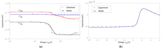 The comparison between the model and datasheet for device , and variation in respect to voltage ( V) is shown in Figure 3a, and that between model and experiment for - variation is presented in Figure 3b, where the experiment results are obtained by 2-port vector network analyser characterisation using S-parameters []. It can be concluded that device interelectrode capacitance values are represented precisely in the compact model. The presented GaN-HEMT model will then be implemented into our developed PEVP software.