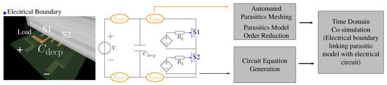 In PEVP, the physical model used for the electromagnetic simulation is determined by PEEC method. Meshing is first applied to generate large numbers of original equations. Afterwards, a Model Order Reduction (MOR) method based on the PRIMA algorithm is used to reduce the numbers of equations; therefore, simulation speed can be accelerated. As compact models are represented by equivalent circuits, they are linked with physical model via electrical boundaries for time domain co-simulation in PEVP. Electrical waveforms can then be obtained. More details on the structure of PEVP and its use for electromagnetic and electro-thermal simulation can be found in our previous work [,].