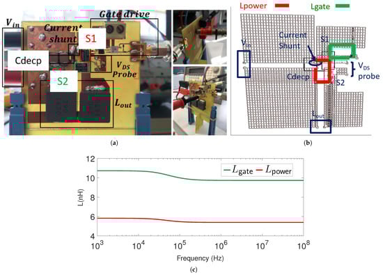 As shown in Figure 5a, a GaN-HEMT (GS66502B) half-bridge circuit is built to measure device switching waveforms. The circuit is also modelled in PEVP, in which the presented modelling approach is used. As illustrated in Figure 5b, the PCB track is physically modelled with its real geometry, and then meshed in PEVP. Devices S1 and S2 are modelled by the presented compact model. The device gate driver, , and load inductor, , are modelled by their equivalent circuits.