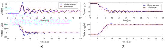 Comparison between simulation and measurement for 200 V/4 A switching transients: (a) Turn-ON. (b) Turn-OFF.