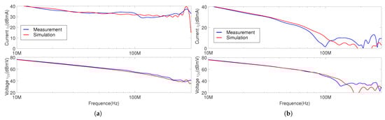 The above and transient waveforms are then converted into frequency domain by FFT to compare their magnitude. A Blackman window function was used to extract and magnitude for turn-ON and turn-OFF. As turn-ON and turn-OFF transient time () is between 5 and 10 ns, the magnitude above 10 MHz is therefore compared, which corresponds to the switching transients (). The results are then illustrated in Figure 7. For turn-ON switching, the magnitude obtained in the simulation matches well with the measurement above 100 MHz, and resonance frequency at 270 MHz was accurately modelled in the simulation. For turn-OFF switching, the magnitude obtained in the simulation matches well with the measurement until 100 MHz. Therefore, it can be concluded that both GaN-HEMT switching transients and switching loop are accurately modelled.