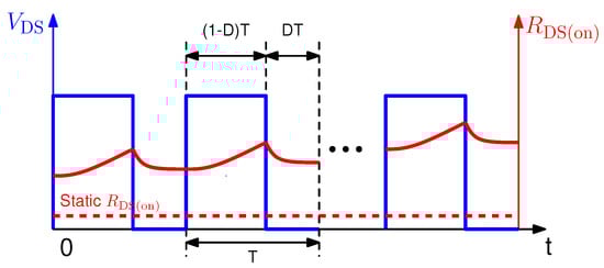 The bias effect on the GaN-HEMT dynamic value can be illustrated in Figure 8. At each switching cycle T, during the OFF-state (), the charge will be trapped by bias voltage in device structure, which will increase its value when it is in ON-state (). This is known as the trapping effect. Then, during the ON-state, those trapped charges will be gradually released, therefore the device value will decrease towards its static value. This is known as the detrapping effect. In order to model the device dynamic value for power electronics converters, it is necessary to obtain dynamic trapping and detrapping time constants.