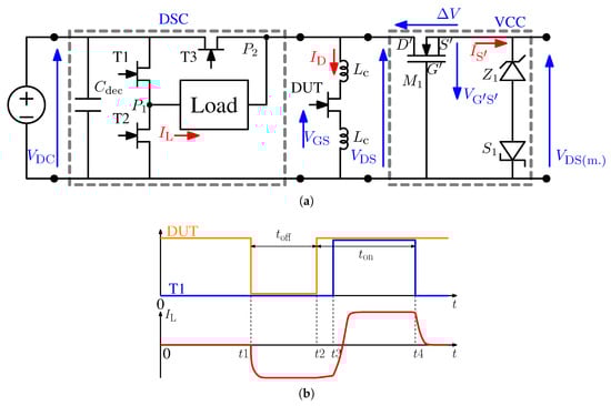 Dynamic of the presented GaN-HEMT is then measured by a proposed electrical circuit shown in Figure 9a. There are mainly two parts in this circuit: device switching circuit (DSC) and voltage clamping circuit (VCC). DSC and DUT form a standard H-bridge circuit. Under the control signal given in Figure 9b (control signals of T2 and T3 are complementary to those of T1 and DUT), DUT hard or soft switching conditions as well as its OFF-state () and ON-state time () can be precisely controlled. can be precisely controlled at interval –. As DUT is under ZVS soft switching at by negative drain current, includes its reverse (–) and forward conduction (–). For VCC, its function is to reduce measurement voltage when DUT is in OFF-state, so as to increase measurement resolution for its ON-state voltage by using a 8–12 bit oscilloscope. When DUT is in the OFF-state, depletion MOSFET voltage ; therefore, a small voltage of a few volts which is equal to Zener diode Zener voltage is measured. When DUT is in the ON-state under both reverse and forward conduction, , which guarantees accurate measurement of (). Device dynamic is then obtained by . More details on the measurement accuracy of the proposed measurement circuit can be found in our previous publication []. In this paper, we focus on the use of this measurement circuit to extract parameters for GaN-HEMT dynamic model.