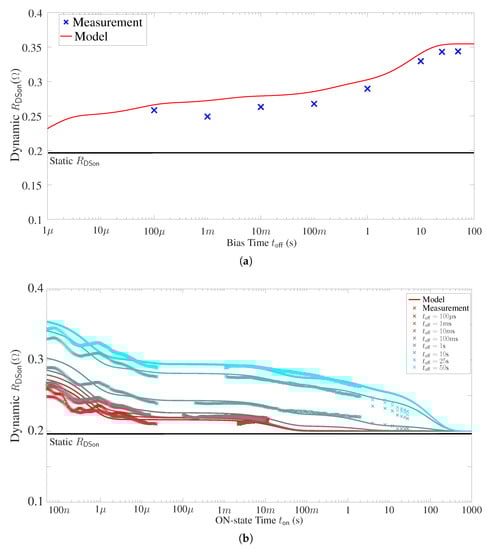The comparison between the model and measurement for GaN device dynamic is illustrated in Figure 10. Five terms are finally used in the model, in which the obtained and correspond to the above analysis. It is also shown that the model represents well the evolution of device dynamic under different bias time and ON-state time . Note that even though there is no measurement data for below 100 s, the data obtained by the model represent a reasonable dynamic evolution. The analytical model will be implemented into the GaN-HEMT compact model, which will be presented in the next subsection.