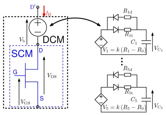 GaN-HEMT dynamic compact model (DCM) is shown in Figure 11. It is constituted by a standard GaN-HEMT compact model (SCM) (e.g., Figure 1) and a behavioural voltage source . When GaN-HEMT is in conduction, its is obtained by Equation (4), where the term corresponds to the exponential function and the term corresponds to of Equation (3).