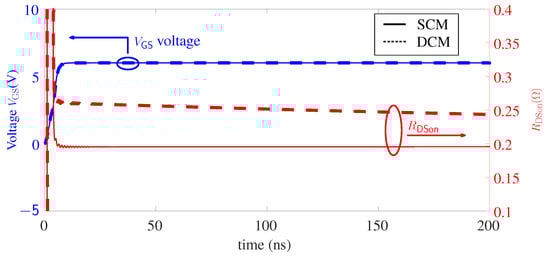 As proposed, GaN-HEMT DCM is a compact model that can be used in different simulation platforms (e.g., PEVP, LTspice, Pspice, SIMetrix, ADS, etc.), and proposed can be also used alone with device manufacturer model. The comparison between DCM and SCM for dynamic simulation after 10 switching periods (100 kHz, D = 50%) is presented in Figure 12. Note that the device dynamic value increases to approximately 20% more than its static value in the proposed DCM, and it decreases slightly with ON-state time, which illustrates the detrapping effect. By contrast, only static value is obtained in SCM. In the next subsection, proposed DCM will be validated by experimental measurements for dynamic value at transient and steady state when device switches at different operation conditions.
