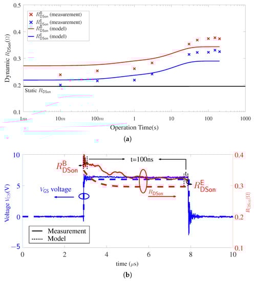 By using the circuit presented in Figure 9a, the GaN-HEMT dynamic value at transient and steady state is at first measured under the following condition: V, A, T1 remains OFF-state (T2 remains ON-state) and DUT switching frequency kHz with D = 50%. Therefore, DUT is operated under soft switching and reverse conduction. Its operation time can be precisely controlled by the numbers of switching cycles. As shown in Figure 12, dynamic value decreases during ON-state. Therefore, we use to represent its average dynamic value at the beginning of each ON-state cycle (within 100 ns) and to represent its average dynamic value at the end of each ON-state cycle (also within 100 ns). The comparison between the model and the measurement for dynamic value at transient and steady-state is presented in Figure 13.