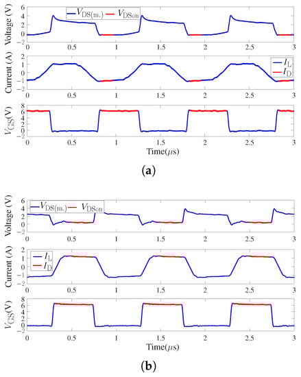 At steady state, measurement waveforms by proposed TZCM when device switches at 1 MHz is presented in Figure 14. By setting an appropriate phase shift value, is in the trapezoidal form. Figure 14a represents the condition that DUT control signal delays that of T2; therefore, device is obtained when it is under constant reverse current conduction (using red curves in Figure 14a). In comparison, Figure 14b represents the condition that T2 control signal delays that of DUT; therefore, device is obtained when it is under constant forward current conduction (using red curves in Figure 14b).