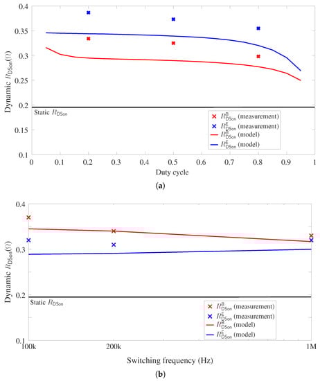 GaN-HEMT dynamic value of different operation conditions: (a) different duty cycles ( kHz) and (b) different switching frequencies (D = 50%).