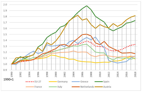 Figure 1 shows the development of CO2 emissions in the transport sector (road, railway, aviation, other) for selected EU countries, over the period of 1990–2018, in relation to 1990. In most of the countries, emissions had been continuously increasing until 2007. After a financial crisis, emissions decreased in most of the countries. However, this decrease was followed by an emission-increasing trend starting from about 2013. Significant differences among countries could also be seen due to country-specific circumstances such as gross domestic product (GDP) and national policy framework.