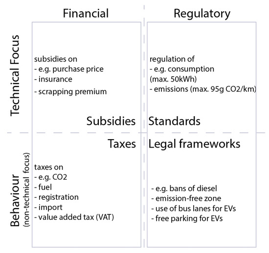 Figure 3 shows four dimensions, which are fundamental for energy policy interventions in general. In principle, the promotion of BEVs can be affected in four different ways, either financial through subsidies and taxes or regulatory through standards or legal frameworks. Figure 3 also includes specific measures for BEVs in the four dimensions.