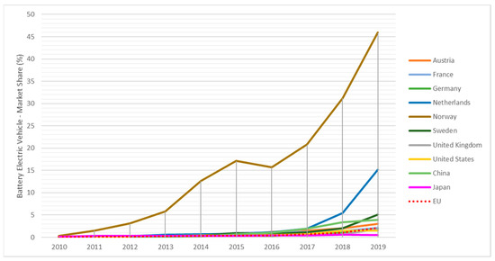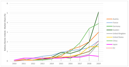 Battery electric vehicle market share in new registrations in major countries with a market share below 6% [36,37].