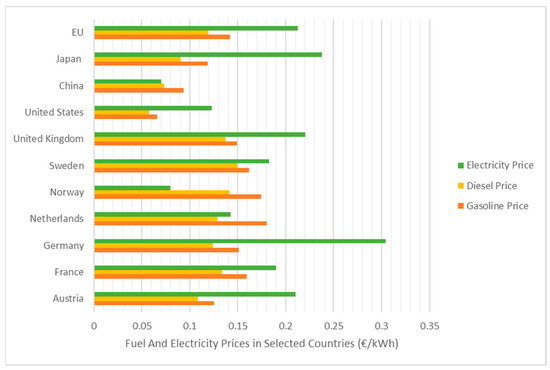 Figure 7 illustrates electricity prices in comparison to fossil fuel costs in passenger car transport in 2020. It can be said that regarding efficiency, one litre of gasoline was comparable with 8.94 kWh and one litre of diesel with 9.97 kWh. The lowest electricity price could be found in China, with 0.07 € per kWh, and in Norway, with 0.08 € per kWh. The largest difference between the electricity price and the gasoline price was in Norway. Germany had the highest electricity price, with 0.30 € per kWh, while the average price in the EU was 0.21 € per kWh. The fuel prices were only lower in a few countries than the electricity prices, e.g., in China and some European countries (both in Norway and diesel in The Netherlands). The lowest fuel prices were in the USA, where one kWh of gasoline cost 0.06 €. The highest costs for fuel could be found in the EU. In The Netherlands, a kWh of gasoline cost 0.18 € and in Norway, 0.17 €. The average gasoline price within the EU amounted to 1.14 € per kWh and the average diesel price to 1.12 € per litre. Usually, gasoline prices were higher than diesel prices due to higher taxes on gasoline.