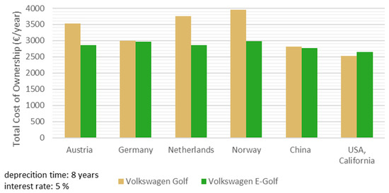 Figure 8 (Case 1—Volkswagen Golf vs. Volkswagen E-Golf) and Figure 9 (Case 2—Audi A5 vs. Tesla Model 3) shows the TCO per year of an ICE and a BEV in selected countries. The costs include subsidies and taxes. A depreciation period of eight years and an interest rate of 5% were assumed.