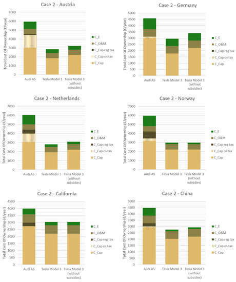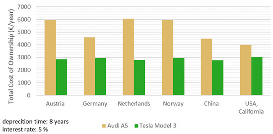 In Case 2 (see Figure 9), TCO per year for an Audi A5 ranged from 3990 € in the USA to 5960 € in Norway and Austria. For a Tesla Model 3, the costs were between 2760 € in China and 4460 € in Norway.