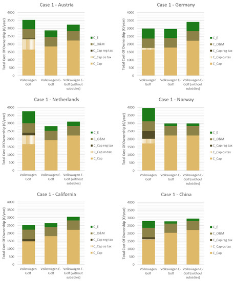 In Case 1 (see Figure 8), total costs per year for a VW Golf ranged from 2520 € in the USA to 3960 € in Norway. For a VW E-Golf, the TCO per year ranged from 2650 € in the USA to 2980 € in Norway.