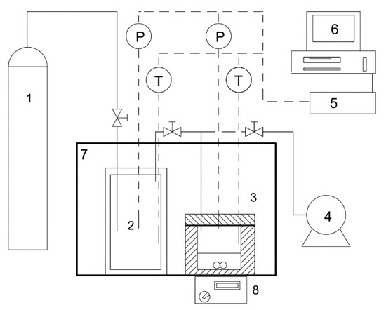 Schematic diagram of CO2 hydrate forming device. 1 Gas cylinder; 2 buffer tank; 3 high-pressure kettle; 4 vacuum pump; 5 data collector; 6 computer; 7 thermostatic bath; 8 magnetic stirrer.