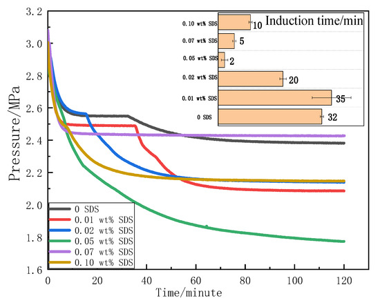 The CO2 hydrates in this study were performed in isochoric systems. Figure 2 shows the pressure and temperature changes in CO2 hydrate formation by adding 0.01, 0.02, 0.05, 0.07, and 0.10% SDS in a 3.5 wt.% NaCl solution. A typical hydrate formation process, which contained a nucleation stage followed by a hydrate growth stage, was observed in the solution with 0.01, 0.02, 0.05 wt.% SDS. In the nucleation stage, the pressure decreases rapidly, which is mainly caused by the rapid dissolution of CO2. When the pressure reached stability, the solution was over-saturated for a short period of time until the formation of stable hydrate nuclei. In the hydrate growth stage, the pressure declined continuously, accompanied by a large heat release due to the growth of CO2 hydrates. The growth pattern of CO2 hydrate was not affected in the presence of SDS, which is consistent with the literature [36,37]. However, the induction time was significantly affected by the concentration of SDS. When the SDS concentration was less than 0.1%, the induction time was reduced from 35 to 2 min with increasing SDS concentration. However, when the SDS concentration increased up to 0.05 wt.%, the induction time of hydrate formation increased up to 0.10 wt.%. Therefore, the 0.05 wt.% SDS concentration had the shortest induction time, and the promotion effect of CO2 hydrate formation was the most obvious. As a result of the salt removal effect of hydrate growth, water in the solution was consumed for hydrate growth, which resulted in an increased concentration of SDS and NaCl. NaCl is a thermodynamic inhibitor; therefore, a high concentration of SDS will also inhibit the formation of hydrates. Thus, the formation effect of hydrate will change accordingly. This was consistent with the observations of Pahlavanzadeh et al. [38] and Partoon et al. [39]. The minimum concentration of surfactant micelle formation is the critical micelle concentration (CMC). When the SDS concentration was higher than the CMC, the best effect of promoting hydrate formation was achieved.