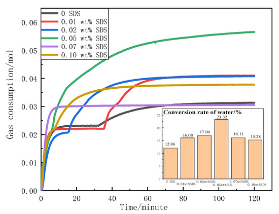 Figure 3 shows the gas consumption and hydrate conversion during the formation of CO2 hydrate in the presence of 3.5 wt.% NaCl and SDS. As shown, the hydrate conversion rate did not exceed 30% within 120 min because the hydrate growth in the late stage would be gradually influenced by gas diffusion in the hydrate phase [18]. The concentration of SDS had no evident influence on the gas solubility. However, the gas consumption continued to grow, and the hydrate conversion rate increased from 12.05 to 23.32% as the SDS concentration increased from 0 to 0.05 wt.%. When the concentration of SDS increased to 0.10 wt.%, the hydrate conversion rate of water also decreased from 23.32 to 15.28%. Thus, it was suggested that 0.05 wt.% SDS solution exhibited a good promotion effect on hydrate formation. In ref. [28], the hydrate formation in porous media was also found to be inhibited, as the SDS concentration surpassed 100 ppm so that the observation in this work is generally in accord with the literature.