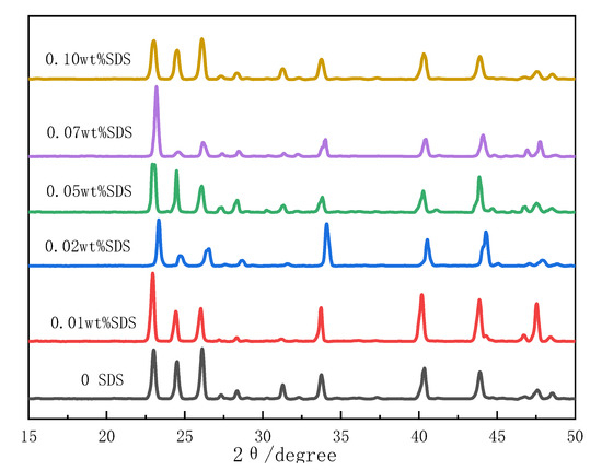 X-ray diffraction (XRD) was used to characterize the XRD patterns of the CO2 hydrate formed by adding SDS to the NaCl solution. Figure 4 shows the diffraction pattern of the CO2 hydrate formed from the NaCl solution without SDS. The peaks at 2θ = 27.0° and 28.3° correspond to the crystal planes (320) and (321) of the structure I hydrate. The peak intensities were not significant owing to the low hydrate conversion rate. Compared with the diffraction pattern of CO2 hydrate, the diffraction patterns of hydrates formed from the NaCl solution with SDS did not exhibit significant deviation in peak positions, as shown in Figure 5, suggesting that the structure of CO2 hydrate formed by adding NaCl solution with SDS was structure I, and the addition of different concentrations of SDS did not affect the structure of the CO2 hydrate crystals.
