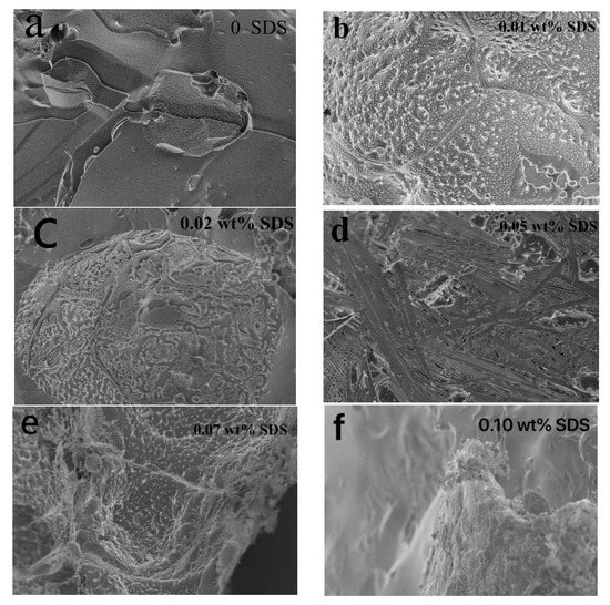 To further understand the influence of NaCl solution with added SDS on the microscopic features of CO2 hydrate, cryo-SEM was employed to show the micromorphology of the samples. All images were captured at a magnification of 5000 times. As shown in Figure 6a, the hydrate surface in the salt solution without SDS was smooth without folds; Figure 6b shows that a significant crimp was observed on the surface of the hydrate formed by adding 0.01 wt.% SDS. In Figure 6c, it is evident the surface of the hydrate formed by adding 0.02 wt.% SDS showed flake structure. Figure 6d shows that when the SDS concentration was 0.05 wt.%, an obvious rod structure on the surface was observed. As shown in Figure 6e, when the SDS concentration is 0.07 wt.%, the hydrate surface shows a bubble structure. Figure 6f shows that when the concentration of SDS was 0.10 wt.%, the hydrate surface presented cluster structure. From the figures, it is evident that with increasing concentration of SDS, the specific surface area increased. When the added SDS concentration is 0.05 wt.%, at this point, the rod morphology can greatly improve the hydrate gas adsorption quantity of CO2 to accelerate hydrate formation. Therefore, the hydrate formation of gas consumption is the largest when SDS concentration is 0.05%, consistent with the macroscopic experimental conclusion in Section 3.1.