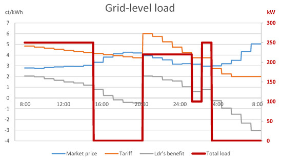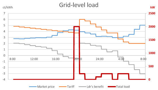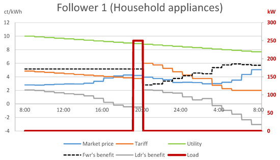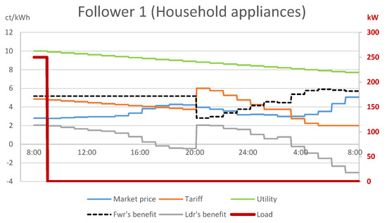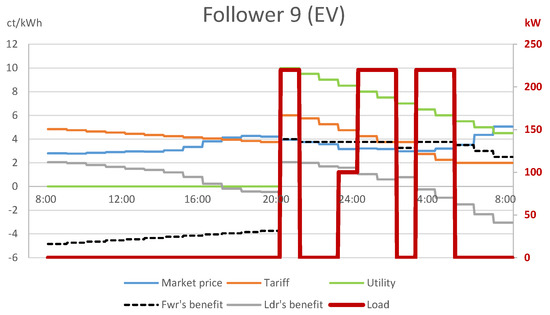 A closer look into the sub-problem faced by follower 1 with household appliances (Figure 2) explains that the retailer achieved the above by compensating for the decreasing utility of followers 1–8 with a similar, decreasing tariff between 08:00 and 20:00, which resulted in a constant net benefit of 5.155 ct/kWh for followers 1–8 in this time interval. Since the followers were indifferent about the choice between these time periods, by the optimistic assumption, they decided on the period which was the most favorable for the leader: the period 08:00–09:00 in case of follower 1. In a similar fashion, the net benefit of follower 9 with EV charging (see Figure 3) was a constant 3.755 ct/kWh for 21:00–02:00 and 03:00–05:00. Hence, consumers charged their EVs in the period 21:00–02:00, to the benefit of the leader. However, this choice comes purely from an unnatural assumption of the mathematical model, which cannot be enforced in reality.