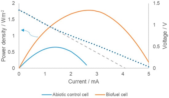 Polarisation profile and the subsequent power density profile of the biofuel cell. The abiotic control cell comprising a zinc anode and air cathode in a PDB electrolyte, which was slightly acidic (pH 6.5).