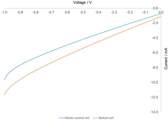 Nevertheless, it must also be pointed out that this work utilised a submerged air electrode in a non-air circulated cell type. MFCs that employ an air electrode either adopt an open-air air electrode (i.e., one side is exposed to air) or the cell is air/oxygen-circulated [27,28,29]. However, the microbial zinc/air cell studied operates solely on dissolved oxygen in the electrolyte. This was intended to substantiate the role of lignin-degrading enzymes excreted by fungal P. chrysosporium in catalysing the reduction of dissolved oxygen on the air electrode. Atmospheric air has approximately 20.9% oxygen by volume (209 mL/Litre), but only 35% of this proportion dissolves in water (i.e., 7–8 mL/Litre at STP) [30]. In such an oxygen-scarce environment, high catalytic activities are required to sustain the ORR. In addition, only Pt-based abiotic catalysts are durable in acidic surroundings [31]. The ability of the MFC to generate and sustain electricity with such limitations only substantiates the biocatalytic ORR on the air electrode. Linear sweep voltammetry measurement was also performed on the air electrode in the electrolyte incubated with P. chrysosporium fed with EFB. The results further support the above conjecture (refer to Figure 4). In the presence of the fungal inocula, the submerged air electrode showed a higher current response over the applied potential range, which suggests increased ORR activity.