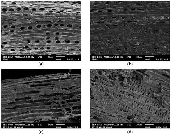 Fungal degradation of the EFB substrate was examined under SEM. Observations were made before and after exposure to P. chrysosporium under submerged culture for a period of 10 days. The SEM images are shown in Figure 7. Following 10 days, the rugged lignin external surface had been smoothed and thinned, resulting from the metabolic activities of the fungal microbes. Shallower silica body craters can be observed in Figure 7b. On day 20, the outer protective lignin layer started to collapse, as shown in Figure 7c. Finally, after one month, the innermost lignin structure was exposed, revealing the fibre’s unique structural core matrix (see Figure 7d). The lignin composition in EFB was approximately 42%, as estimated from the thermogravimetric analysis (results not shown). The recalcitrant nature of lignin is evident from the SEM images. It took around one month for the fungal microbes to penetrate deeply into the lignin structure’s inner core. From the viewpoint of the MFC’s performance, the gradual degradation of lignin is favourable. Indeed, this ensures that the electrochemical system has a continuous supply of biocatalysts and radical oxidants, provided that the discharge current does not exceed the limiting charge transfer rate of the redox reactions involved. For the MFC studied in this work, the discharge data suggest that 1 mA is a well-balanced charge transfer rate. Attempts at a higher discharge rate only lasted several days.