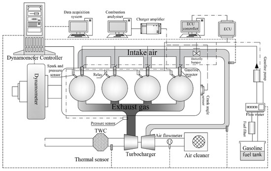 The experimental setup is shown in Figure 1. Experiments were conducted with a 1.5-L four-stroke, GDI SI engine with a four-cylinder inline design and a turbocharger. The fuel was RON 92# gasoline. The exhaust manifold (4-1 type) of the engine was integrated into the cylinder head. The ignition timing was 1-3-4-2. The engine was coupled to an alternating current dynamometer (AVL DynoRoad 202/12 Sx) to adjust the operating parameters, such as engine speed and torque. Four piezoelectric pressure transducers (AVL ZI33 Y3M) were flush mounted on the cylinder head to acquire the in-cylinder pressure data. The natural frequency of the pressure transducer is approximately 150 kHz, with a resolution of 0.1 kPa. The high frequency pressure oscillation in the exhaust pipe was measured by the Kistler type 6041B water-cooled pressure transducer, and the transducer was cooled by Kistler 2621 conditioning system. Pressure signal was triggered using a digital encoder coupled to the crankshaft with a resolution of 0.1 °CA. The signals were sent to an AVL 4P4G charge amplifier and acquired by an AVL combustion analyzer.