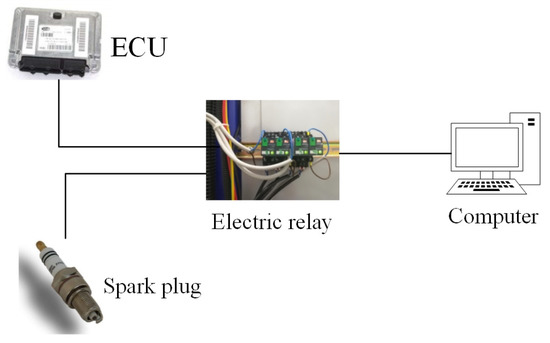 The experiment is divided into two parts. The first part collected the in-cylinder pressure of the four cylinders synchronously. In the second part, the three cylinders’ pressure and exhaust pipe pressure curves were collected synchronously. The one key point of the experiments was to control the ignition timing by cutting off the ignition coil of the electronic ignition system. A manual control method was adopted in this experiment. The schematic diagram of the control circuit is shown in Figure 2. The computer controlled the ignition coil through an electric relay. When the relay was disconnected, the spark plug could not receive the spark signal from the electronic control unit (ECU). With a total of 4 channels, the spark plugs of four cylinder all could be controlled. Since super-knock occurs randomly, engine cycles have to be recorded continuously to capture super-knock cycles. The process of the test, in terms of the maximum amplitude of pressure oscillations (MAPO) time history of the four different cylinders, is shown in Figure 3. Pressure traces of 500 successive engine cycles misfired were recorded. Super-knock and pre-ignition could be distinguished by cylinder pressure. In Figure 3, the ignition coil of cylinder 3 was manually turned on and off. When the ignition coil was turned off, the MAPO was rapidly reduced. After the ignition coil was on, the MAPO returned to its normal value. In order to avoid the contingency of the experimental results, the experiments also were conducted on another engine of the same model to repeat the same ones.