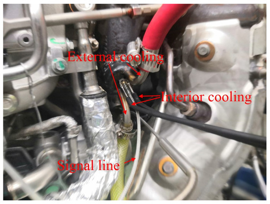 The other key point is to capture abnormal exhaust pressure fluctuations. The installation of exhaust pipe pressure transducer is shown in Figure 4. The water channel was further designed on the mounting base of the transducer, and two sets of cooling water circulation ensured the normal operation of the pressure transducer. The combustion analyzer used in this bench only has four channels. In order to collect cylinder pressure and exhaust pipe pressure synchronously, the exhaust pipe pressure signal will replace the cylinder pressure signal of a certain cylinder during the experiment.