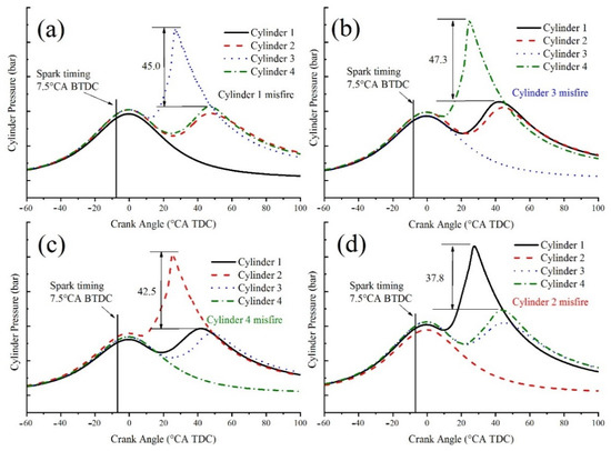 To explain the effect of misfires on engine combustion, the results at 1500 r/min and WOT were presented. Figure 6 shows the engine test results of four cylinders’ pressure trances under misfires occurring in one cylinder. Figure 6a–d show the four cylinders’ pressure curves under misfires at cylinder 1, cylinder 3, cylinder 4, and cylinder 2, respectively. This sequence is the same as the ignition timing (1-3-4-2). The spark timing at 1500 r/min and WOT was 7.5 °CA before top dead center (BTDC), which was controlled by the original ECU of the engine, and not adjusted to induce knock. Figure 6 indicates one regular pattern: misfire in one cylinder would induce abnormal combustion in the next ignition cylinder corresponding to the misfired cylinder. The Pmax (maximum cylinder pressure) in the next ignition cylinder corresponding to the misfired cylinder increased significantly compared to that in the other two cylinders. In Figure 6b, cylinder 3 misfired, the Pmax of cylinder 4 was larger than the Pmax of cylinder 1 and cylinder 2 by 47.3 bar. In addition, the combustion phase of the next ignition cylinder corresponding to the misfired cylinder advanced significantly compared to that in the other two cylinders. The in-cylinder pressure profile of cylinder 4 significantly deviates from the normal combustion cycle of cylinder 1 and cylinder 2 at −9 °CA BTDC (Figure 6b). However, the in-cylinder pressure profile of cylinders 1 and 2 deviates from the normal motor cycle of cylinder 3 at −18 °CA BTDC.