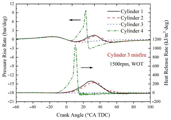 Figure 7 shows the pressure rise rate and heat release rate of the four cylinders when cylinder 3 (Figure 6b) was misfired. Figure 7 shows that the maximum pressure rise rate of cylinder 4 could reach 10 bar/°CA, which was much larger than the pressure rise rate of the other two cylinders. The heat release of cylinder 4 was obviously advanced, and the combustion duration was shortened compared to those of the other cylinders. These phenomena occurred because the thermodynamic state of the unburned gas in cylinder 4 was enhanced when cylinder 3 was misfired.