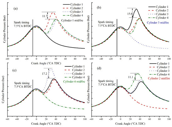 Abnormal combustion in the last ignition cylinder corresponding to the misfired cylinder: (a) misfired in cylinder 1; (b) misfired in cylinder 3; (c) misfired in cylinder 4; (d) misfired in cylin-der 2.