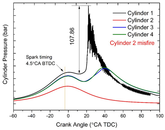 The in-cylinder pressure curves shown in Figure 6 and Figure 8 have no obvious oscillations. However, super-knock was also detected. Figure 9 shows the four cylinders’ pressure curves under misfire occurring in cylinder 2. The corresponding operating point was 2000 r/min and WOT. The spark timing is 4.5 °CA BTDC. In Figure 9, cylinder 2 was misfired, leading to super-knock in cylinder 1, which was the next ignition cylinder corresponding to the misfired cylinder. The Pmax of cylinder 1 increased sharply, accompanied by intense pressure oscillations. Compared with normal combustion, the peak pressure of super-knock could exceed three times higher. A strong detonation wave, which rapidly swept through the pressure transducer, leading to the pressure “discontinuity” of a correspondingly rapid pressure rise of 107.86 bar. This result indicated that misfire in one cylinder will induce super-knock in the next ignition cylinder corresponding to the misfired cylinder. It should be noted that the exhaust stroke of the misfired cylinder corresponds to the power stroke of the knock cylinder. This result indicated that misfire in one cylinder would induce super-knock in the cylinder before starting the power stroke.