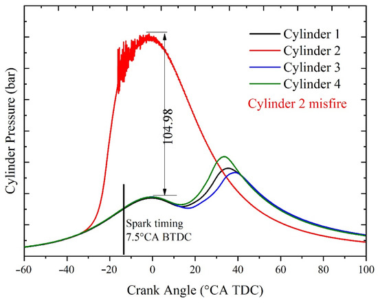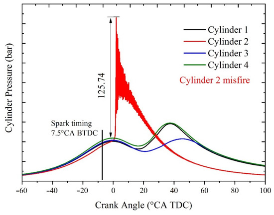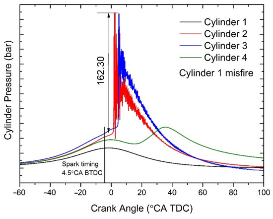 - A misfire in one cylinder could induce pre-ignition. The in-cylinder pressure profile significantly deviated from the normal combustion cycle at 30 °CA BTDC, which indicated a pre-ignition before the normal spark timing of 7.5 CA BTDC. After the occurrence of combustion, the exhaust gas discharged from the misfired cylinder produced an obvious pressure pulse.